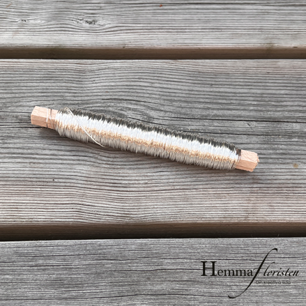 Silverfärgad spoltråd. Dekorativ och passar alla typer av binderier. Lite tjockare än myrtentråd.