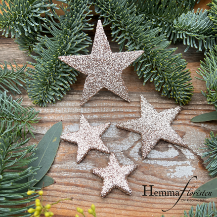 Vackra stjärnor med glitter i varm champagnefärg, perfekta att dekorera jul- eller nyårsdukningen, ljusfatet, juldekorationen eller limma fast på dörrkransen. En mix av fyra storlekar gör det enkelt att skapa en levande och festlig känsla.